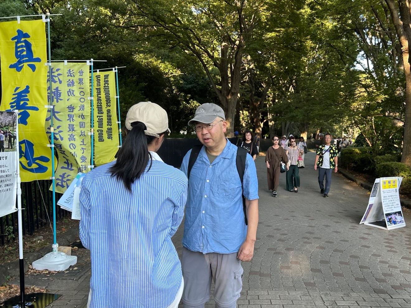 '图1~4:二零二五年九月六日、七日的周末,法轮功学员来到东京代代木公园设立真相展位,时值中日文化交流活动,不少人从活动会场走出来了解法轮功真相。'