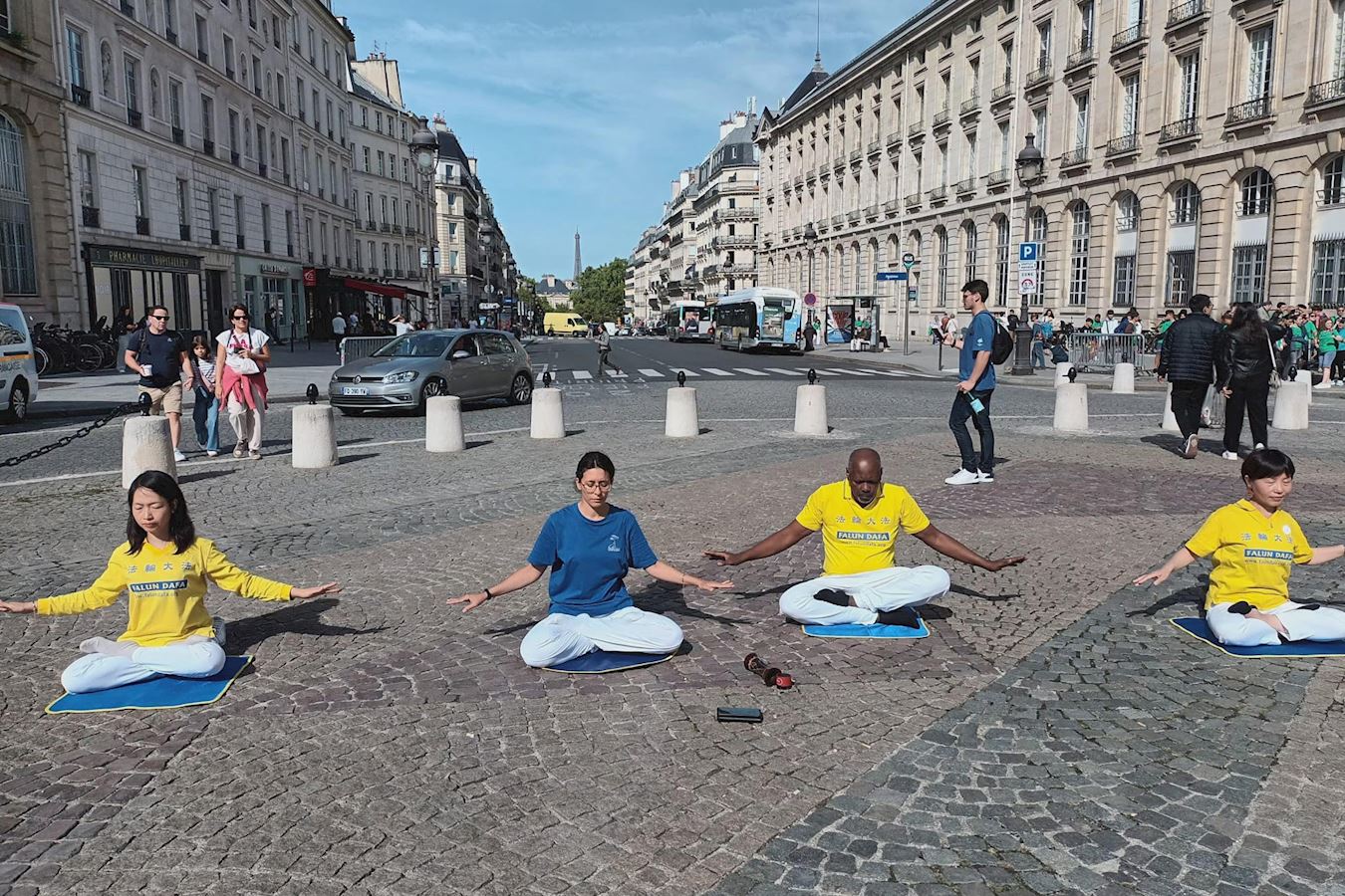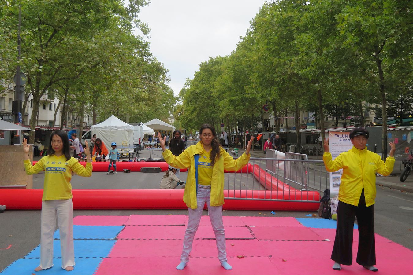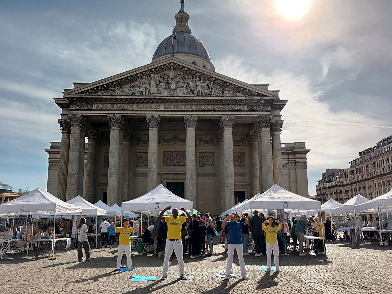 '图1~5:九月六日,在巴黎先贤祠广场五区市政府举办的协会论坛上,法轮功学员展示法轮功功法,向民众介绍法轮功。'