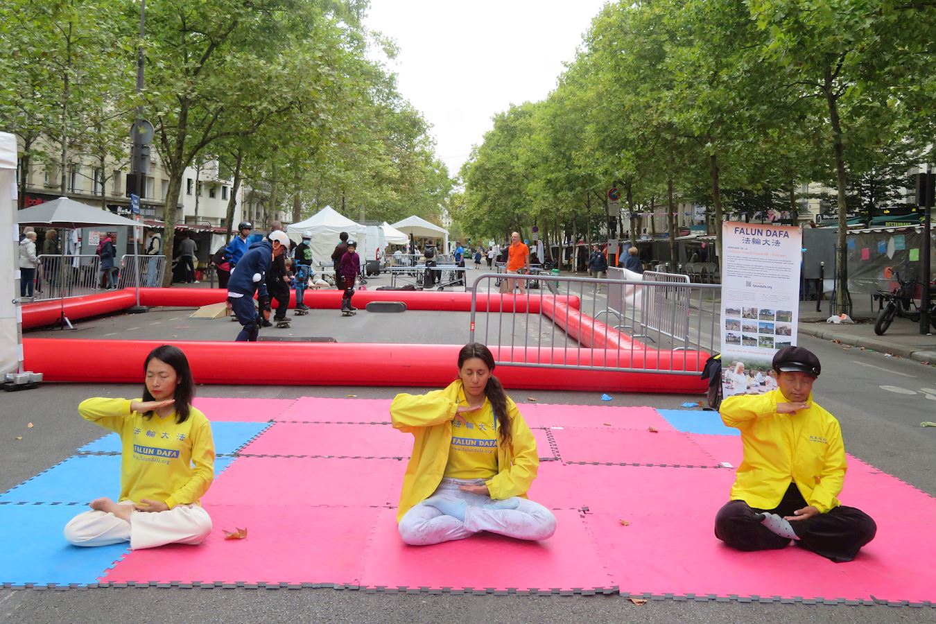 图1~5:九月六日,在巴黎先贤祠广场五区市政府举办的协会论坛上,法轮功学员展示法轮功功法,向民众介绍法轮功。