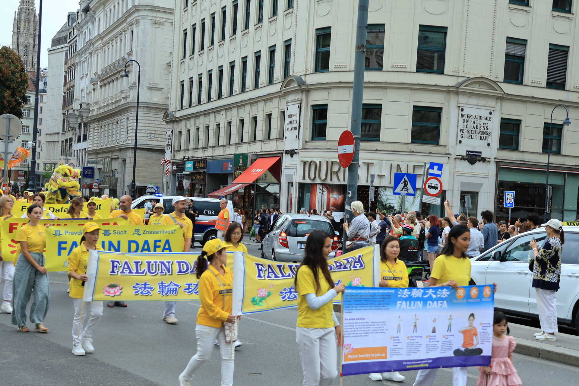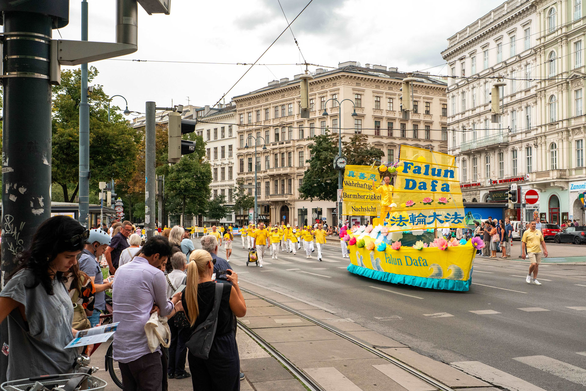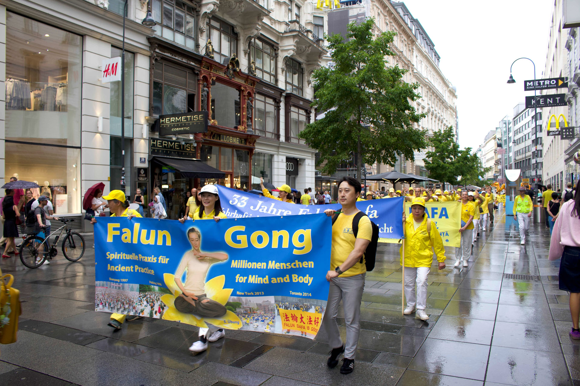 当天,法轮功学员在维也纳市中心赫尔穆特·齐尔克广场(Helmut-Zilk-Platz)举办了信息日活动,下午游行队伍从此广场出发,途经国家歌剧院,议会大厦,弗赖翁广场(Freyung)等著名景点,通过环城大道(Ringstrasse),格拉本大街(Graben)克恩滕大街(Kärntner Strasse)等购物步行街。
