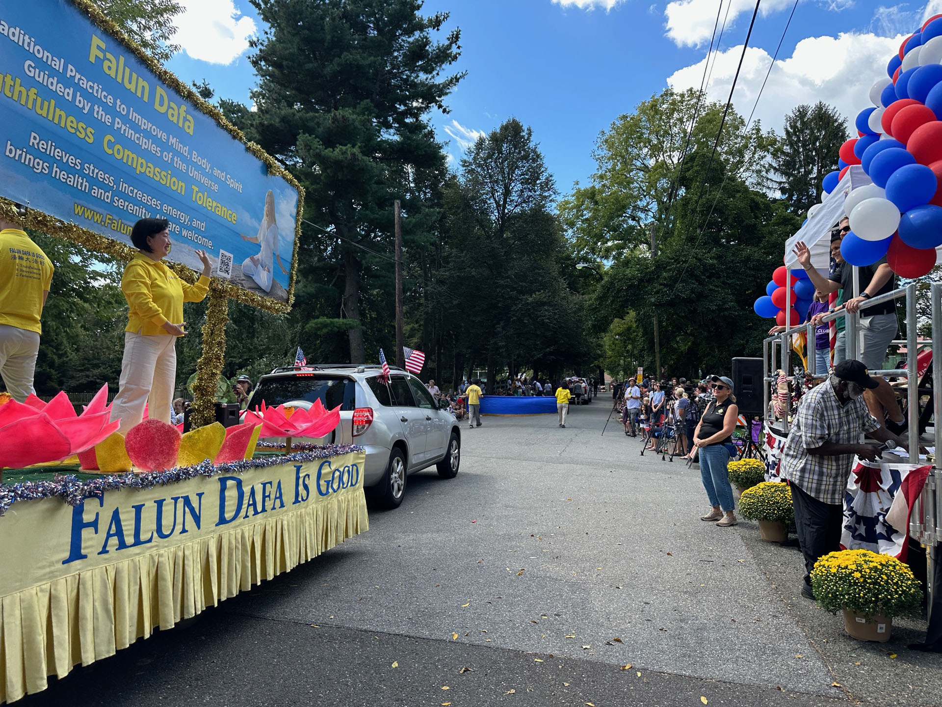 游行开始前,当地居民已在街道两旁等候观看。法轮功学员手持写有“法轮大法”、“世界需要真善忍”的横幅,两位学员在花车上展示法轮功功法。