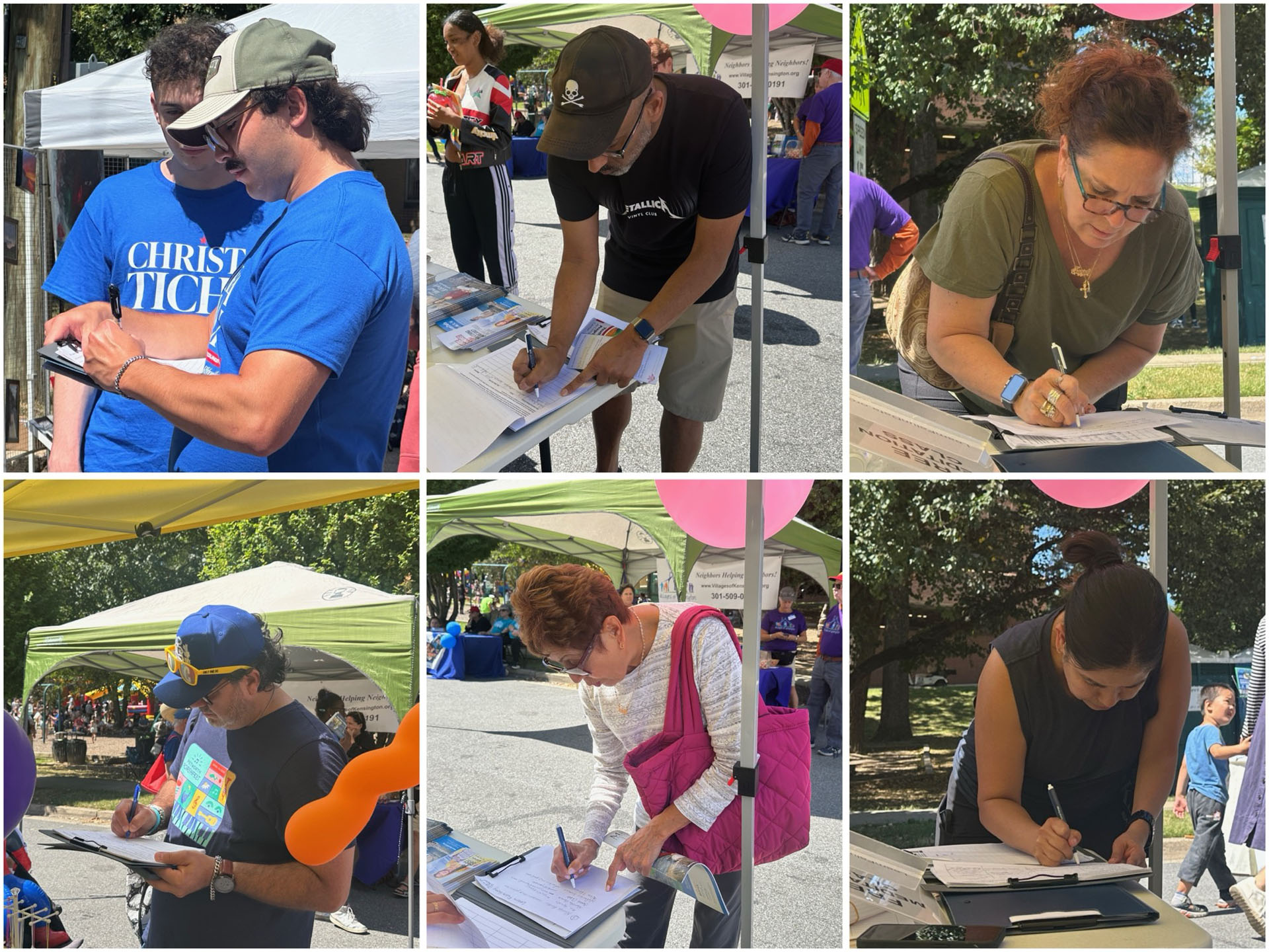 在法轮功展位前,有些了解了真相的人在呼吁制止迫害的征签表上签名,声援法轮功学员。