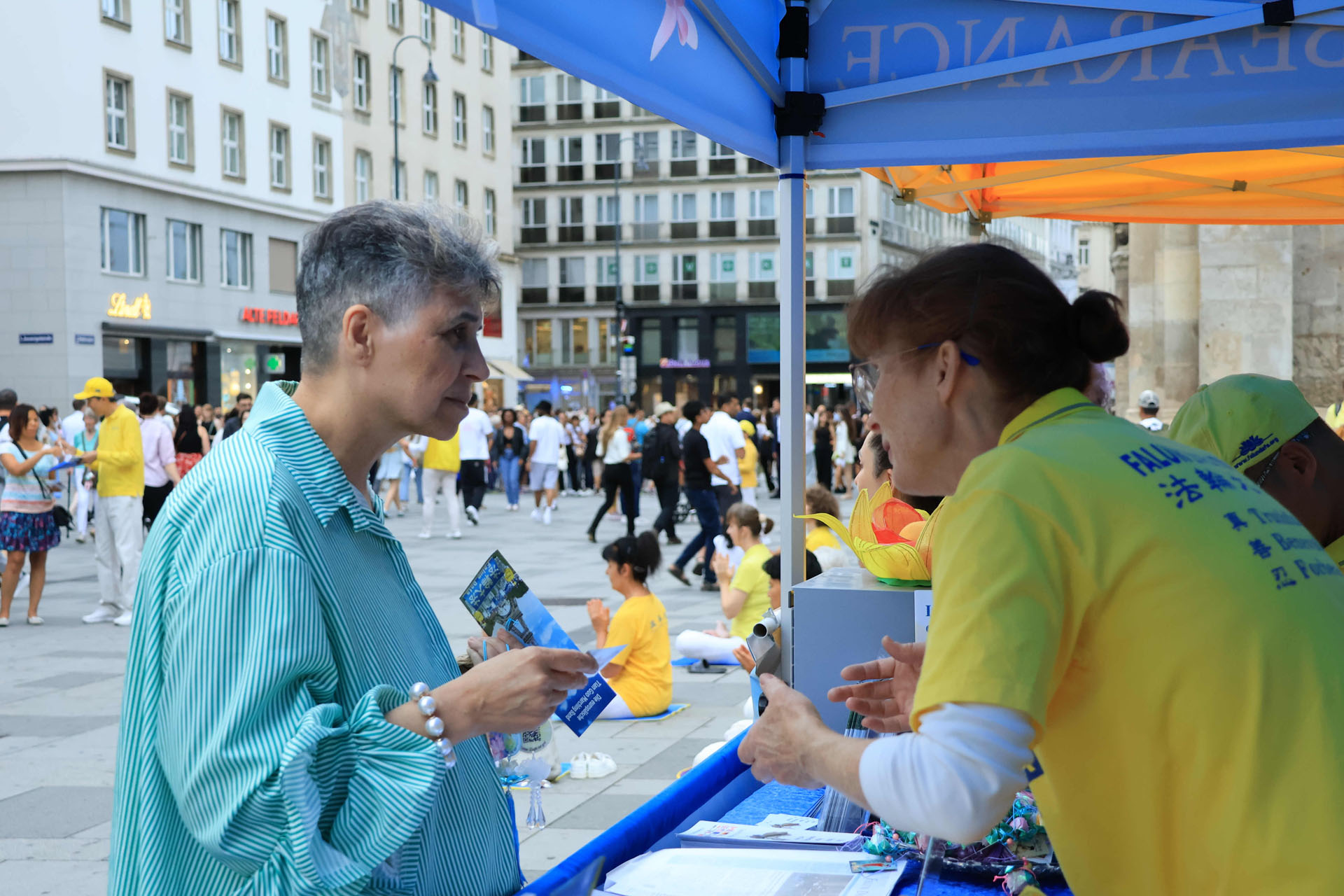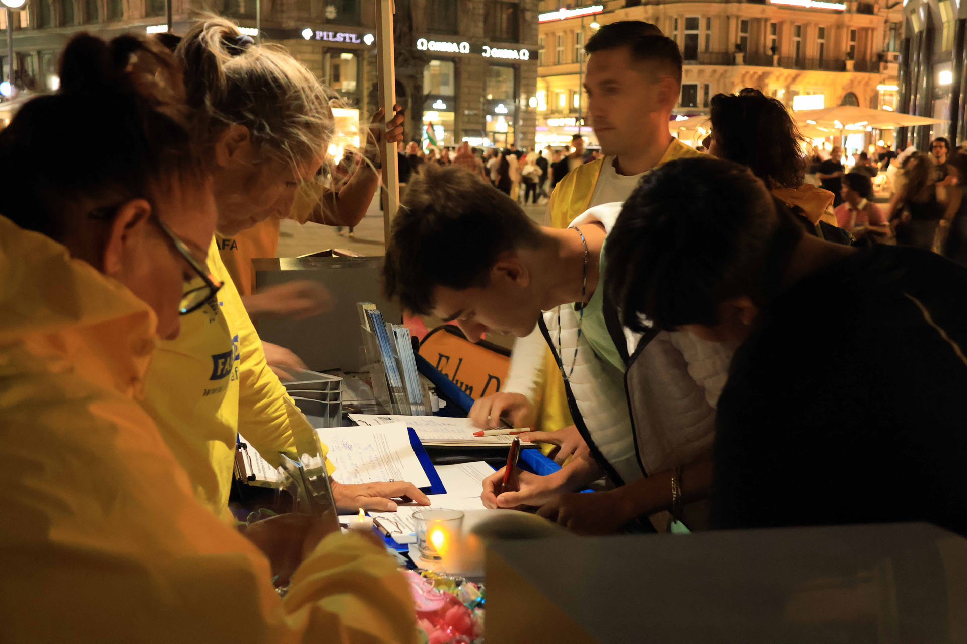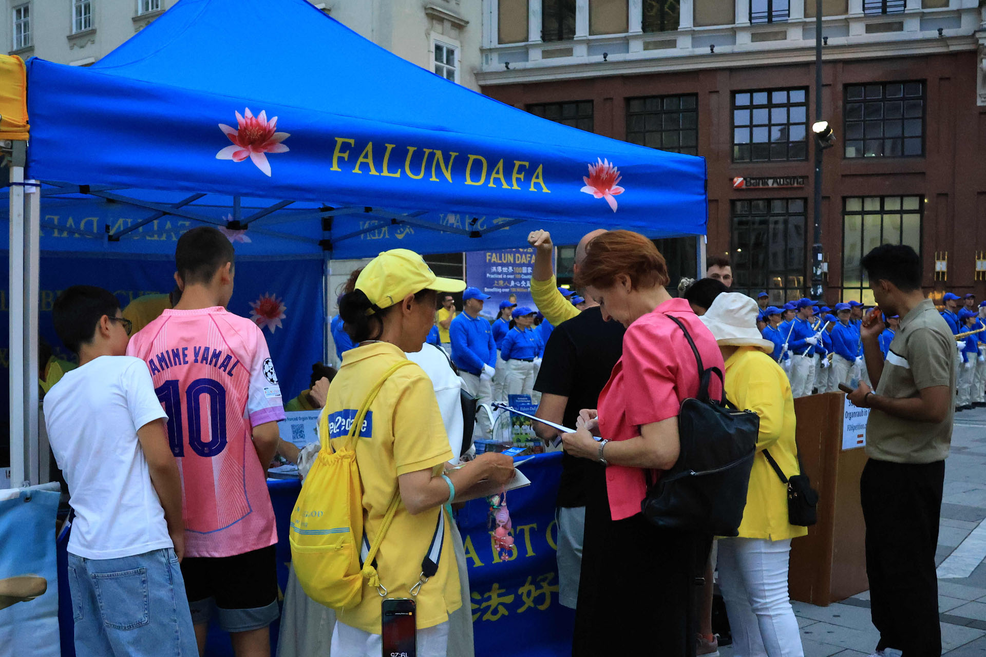 斯蒂芬广场上有著名的圣斯蒂芬大教堂,是游客必到之处,也是当地人聚集的热门地点,在夜晚路人依然络绎不绝。他们有的认真聆听学员演讲,了解仍在中国发生的对信仰真善忍的法轮功学员的迫害;有的接过学员发送的真相资料,并询问更多讯息;有的观看展出的照片,获悉学员二十六年来各种和平反迫害活动;有的来到醒目的天蓝色帐篷前,获得更多资料。了解真相的人们纷纷签名支持法轮功学员,要求制止中共迫害法轮功学员及活摘器官的罪行。