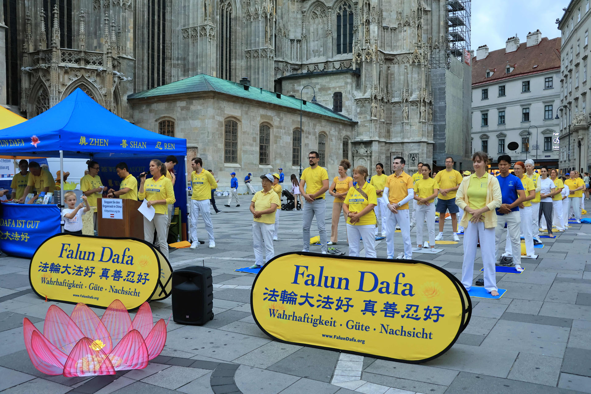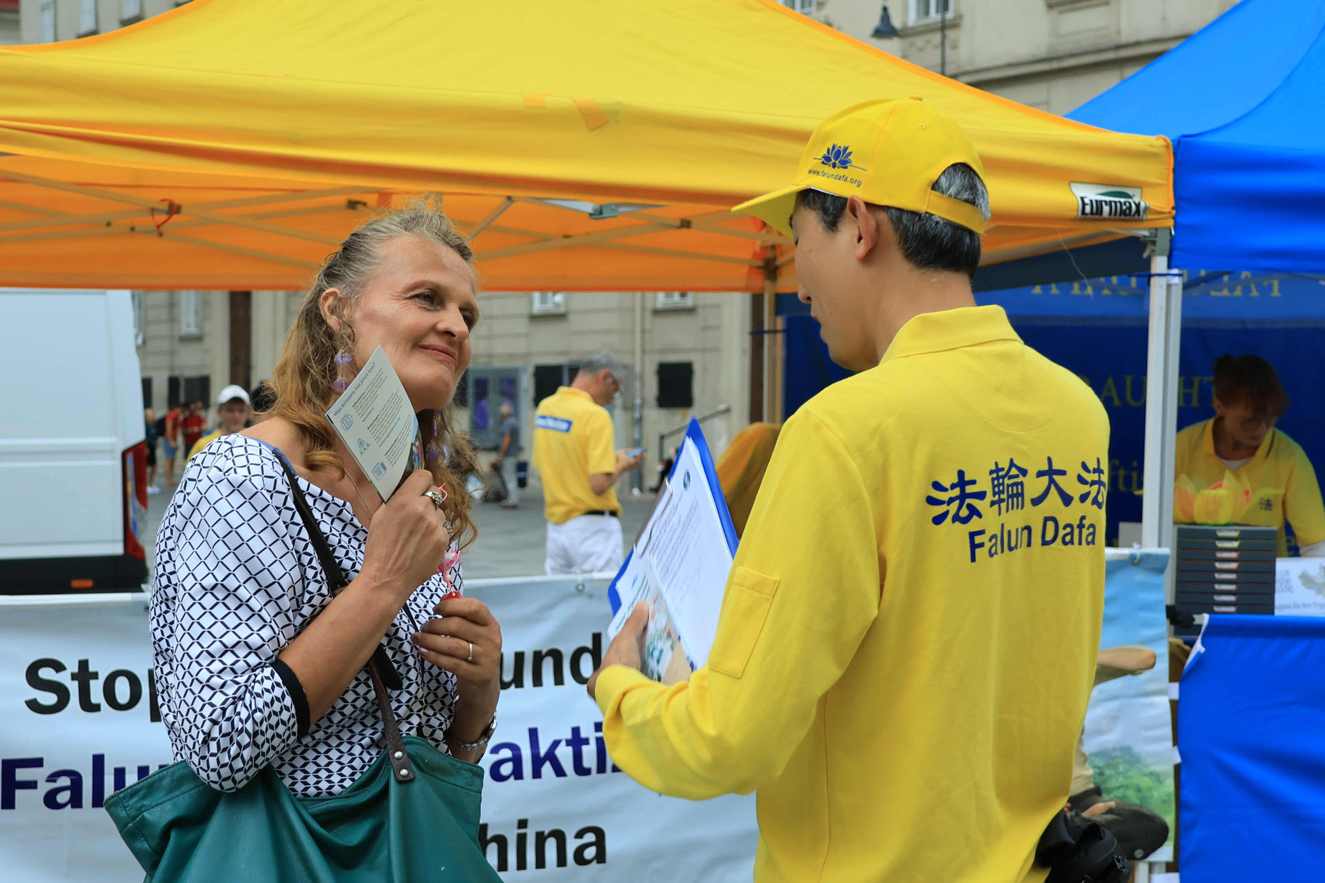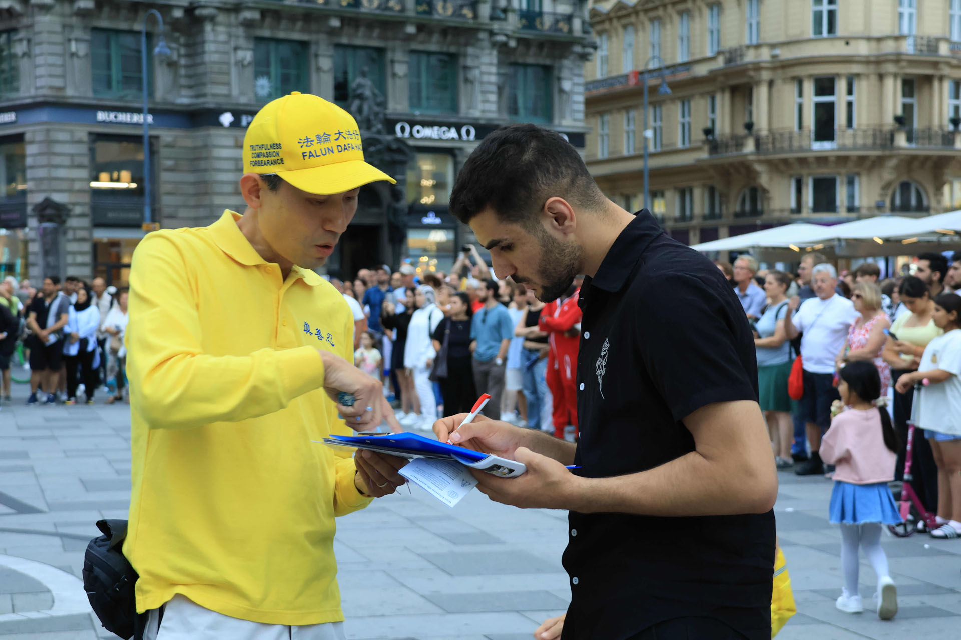 斯蒂芬广场上有著名的圣斯蒂芬大教堂,是游客必到之处,也是当地人聚集的热门地点,在夜晚路人依然络绎不绝。他们有的认真聆听学员演讲,了解仍在中国发生的对信仰真善忍的法轮功学员的迫害;有的接过学员发送的真相资料,并询问更多讯息;有的观看展出的照片,获悉学员二十六年来各种和平反迫害活动;有的来到醒目的天蓝色帐篷前,获得更多资料。了解真相的人们纷纷签名支持法轮功学员,要求制止中共迫害法轮功学员及活摘器官的罪行。