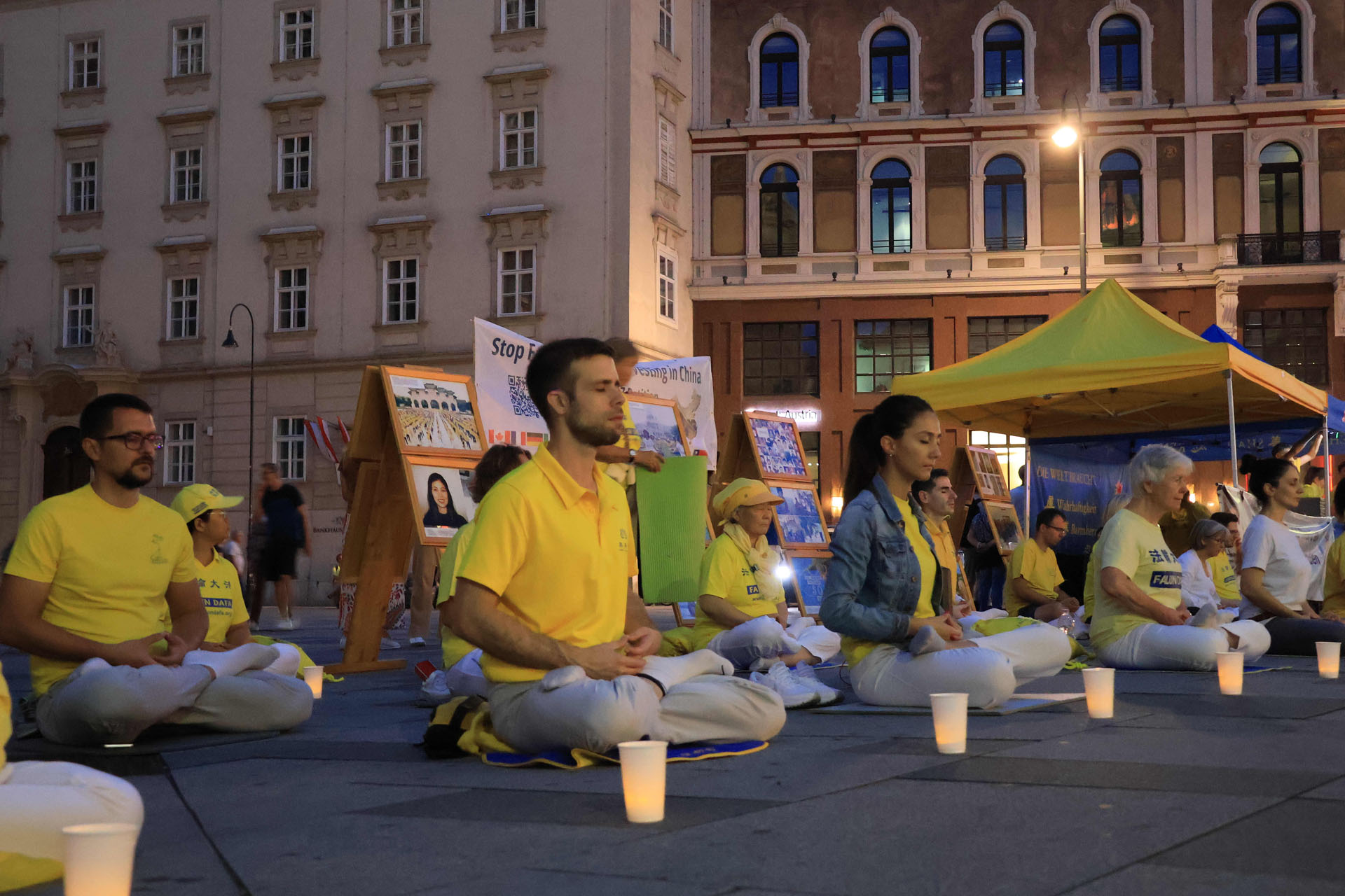 【明慧网二零二五年九月四日】(明慧记者高思羽奥地利维也纳报道)二零二五年八月二十九日傍晚,来自欧洲十多个国家的法轮功学员在奥地利维也纳斯蒂芬广场(Stephansplatz)上演示功法,告诉人们法轮大法的美好。随着夜色渐浓,他们在点点烛光下静静打坐,纪念二十六年来被迫害失去生命的法轮功学员。