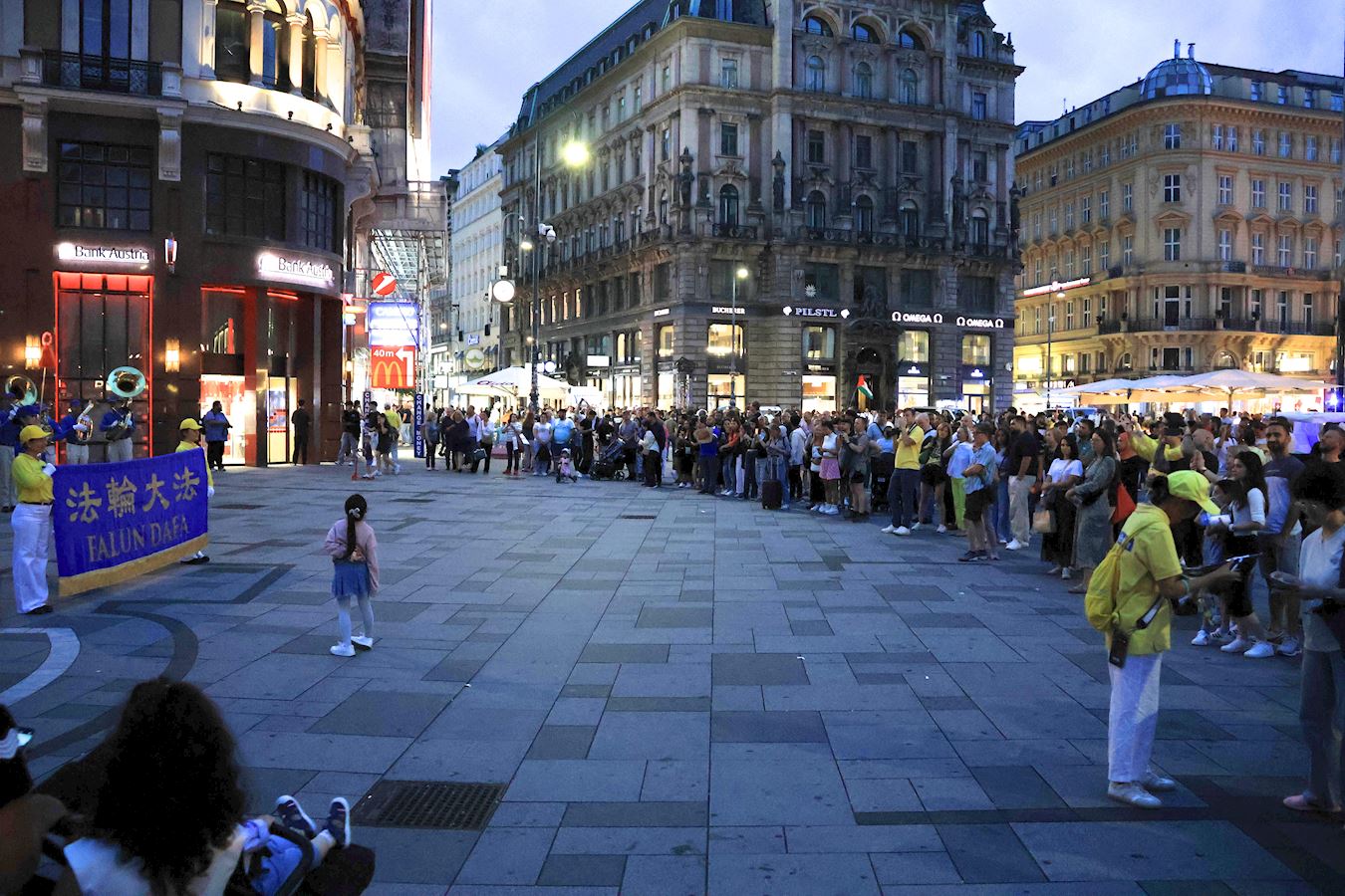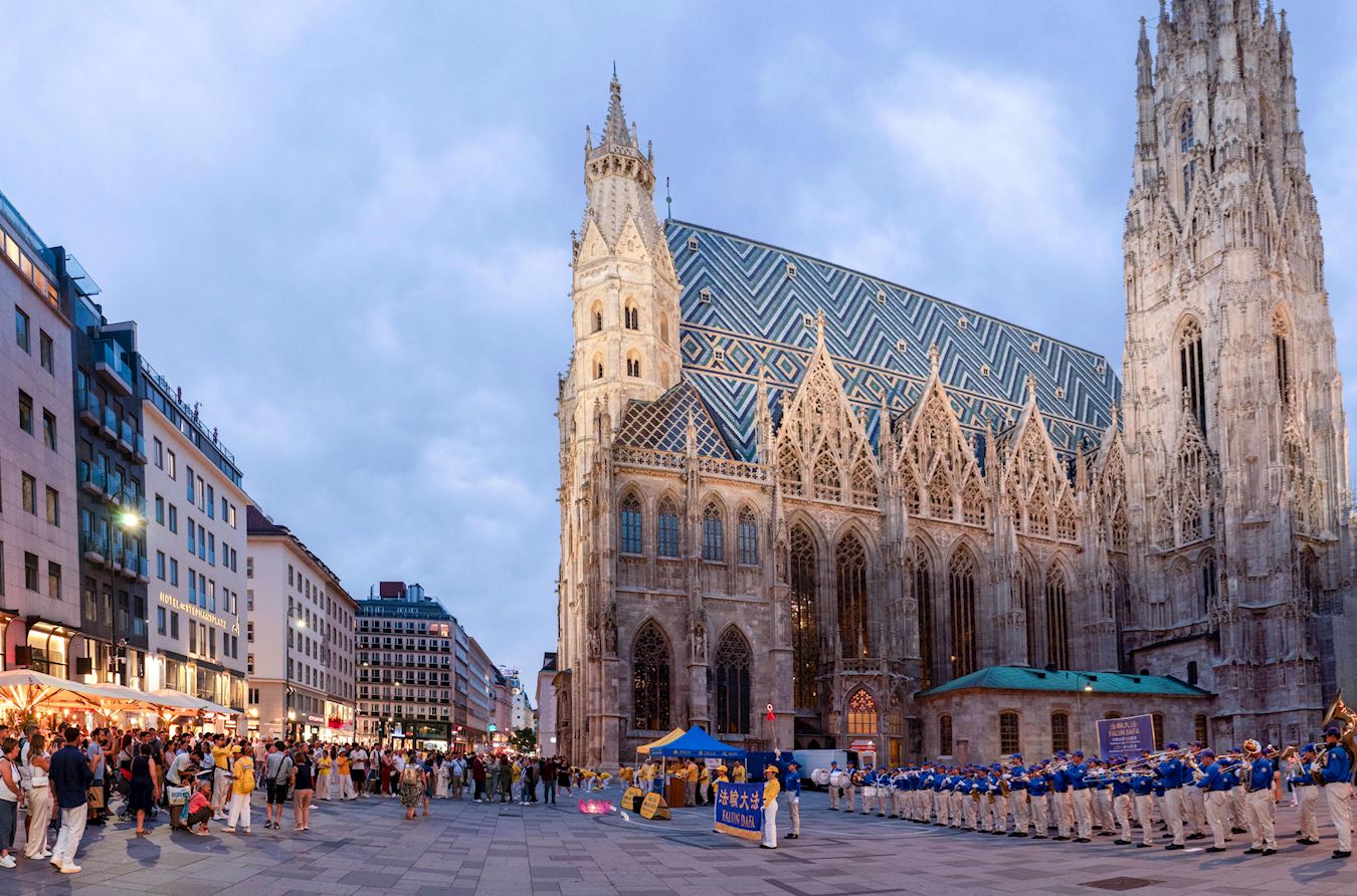 在音乐之都维也纳能感受到浓浓的音乐氛围,一下飞机就有圆舞曲相伴,漫步街头也常可听到乐器演奏。二零二五年八月二十九日傍晚,当来自欧洲十多个国家的法轮功学员组成的天国乐团在斯蒂芬广场(Stephansplatz)站队准备演出时,众多路人就纷纷聚拢,期待演奏。