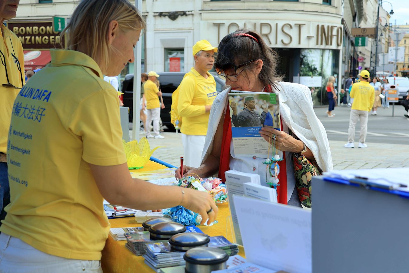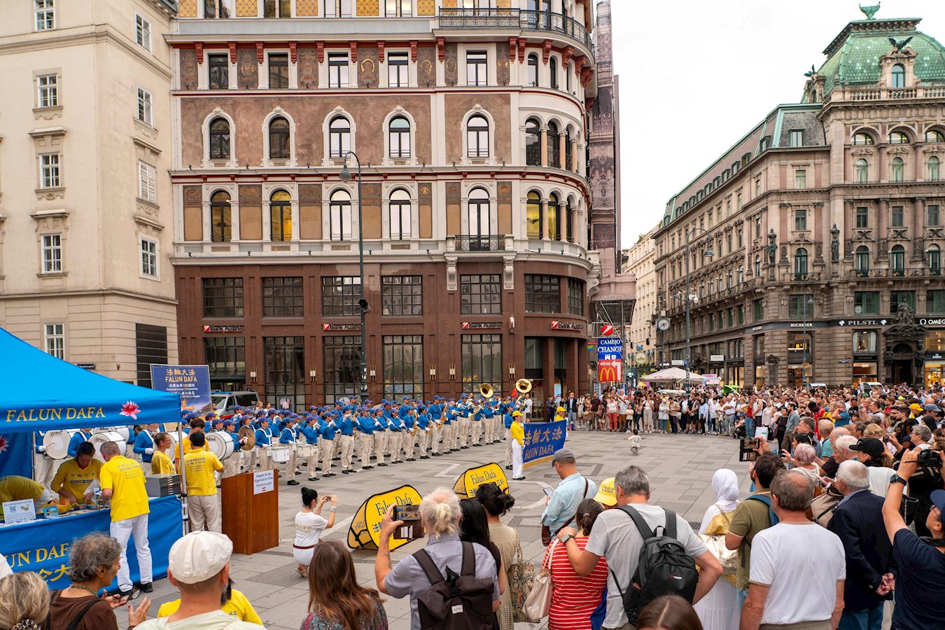 【明慧网二零二五年九月五日】(明慧记者高思羽奥地利维也纳报道)“非常美好的音乐,我只听了几分钟,就觉得我的灵魂仿佛到了另一个世界。我还看到有人打坐,这在维也纳可不常见。我要去了解更多关于法轮大法的讯息。”“音乐很美妙,还有他们的纪律性和着装,都让我们驻足。”二零二五年八月二十九日及三十日,由欧洲法轮功学员组成的天国乐团演奏及歌唱表演,让音乐之都的民众感到耳目一新。