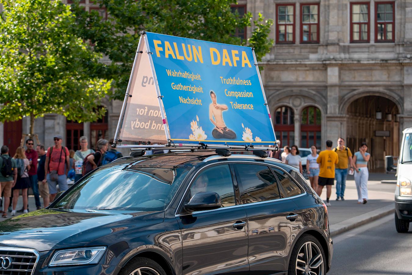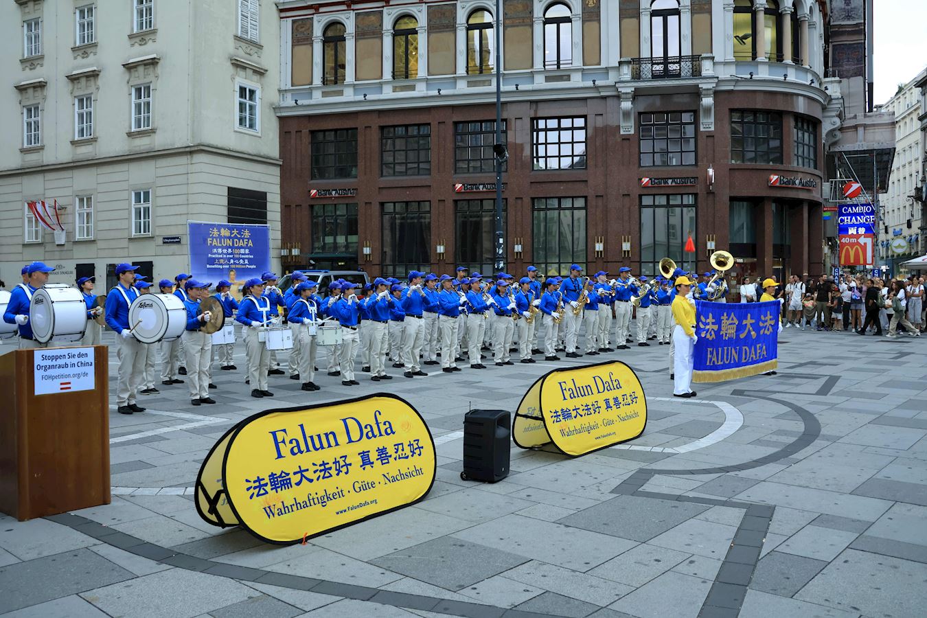 下午法轮功学员在维也纳市中心游行,天国乐团的演奏及功法演示将法轮大法的美好带到大街小巷,闹市区及景点。各种横幅及模拟活摘器官的场景,也让更多人了解正在中国发生的迫害。