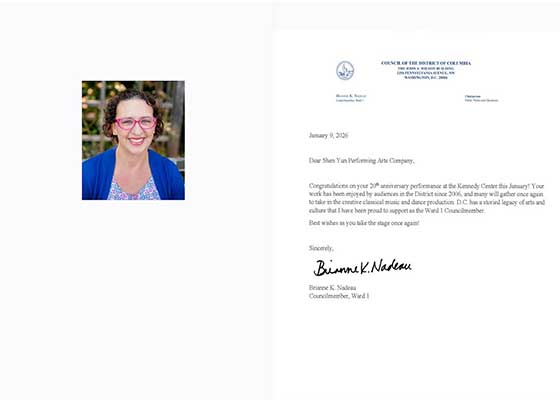 一月九日,首都华盛顿市议员布莱恩·纳多女士给神韵艺术团发来贺信,祝贺神韵成立二十周年之际,再一次在肯尼迪中心演出。