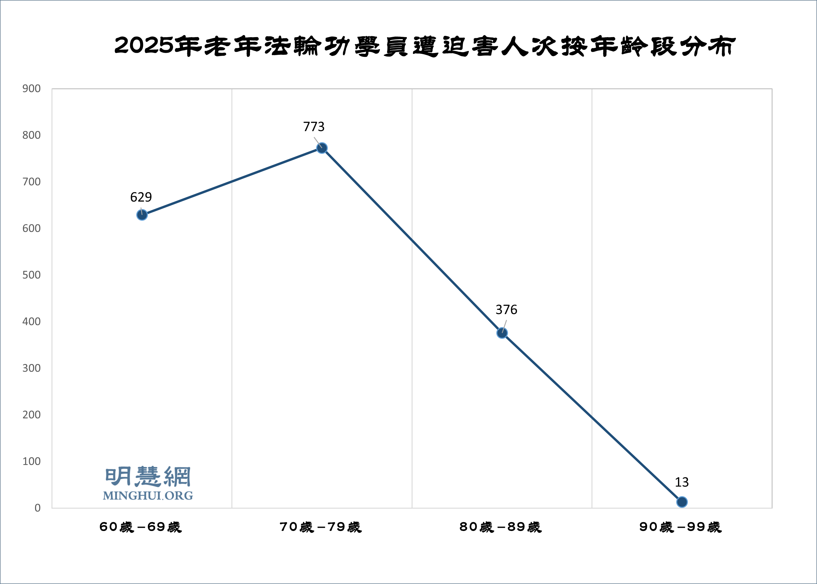 据明慧网二零二五年不完全统计:二零二五年获知中国大陆法轮功学员遭中共非法判刑的至少有751人,已知年龄的一共498人,其中370名是60岁以上老年法轮功学员——90岁以上1人,80~90岁33人,70~80岁156人,60~70岁180人。绑架骚扰法轮功学员4803人,其中知道年龄、60岁以上法轮功学员947人,实际老人人数至少一半以上。