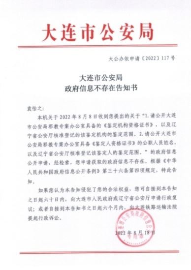 如上第八条所示,大连法轮功学员刘红霞被迫害期间,家属向大连市公安局申请公开“认定意见”文件,得到的答复却是“该信息不存在”,进一步揭示了迫害法轮功案件证据的伪造和不合法性:不存在相关鉴定机构的合法资格证书;不存在鉴定人资格证书及其核准登记信息。