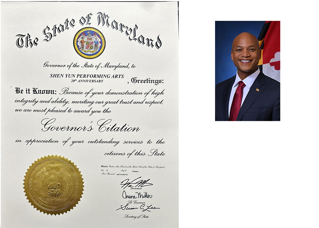 美国马里兰州州长韦斯·摩尔恭贺神韵艺术团成立二十周年,于二零二六年初颁发“州长嘉奖”。