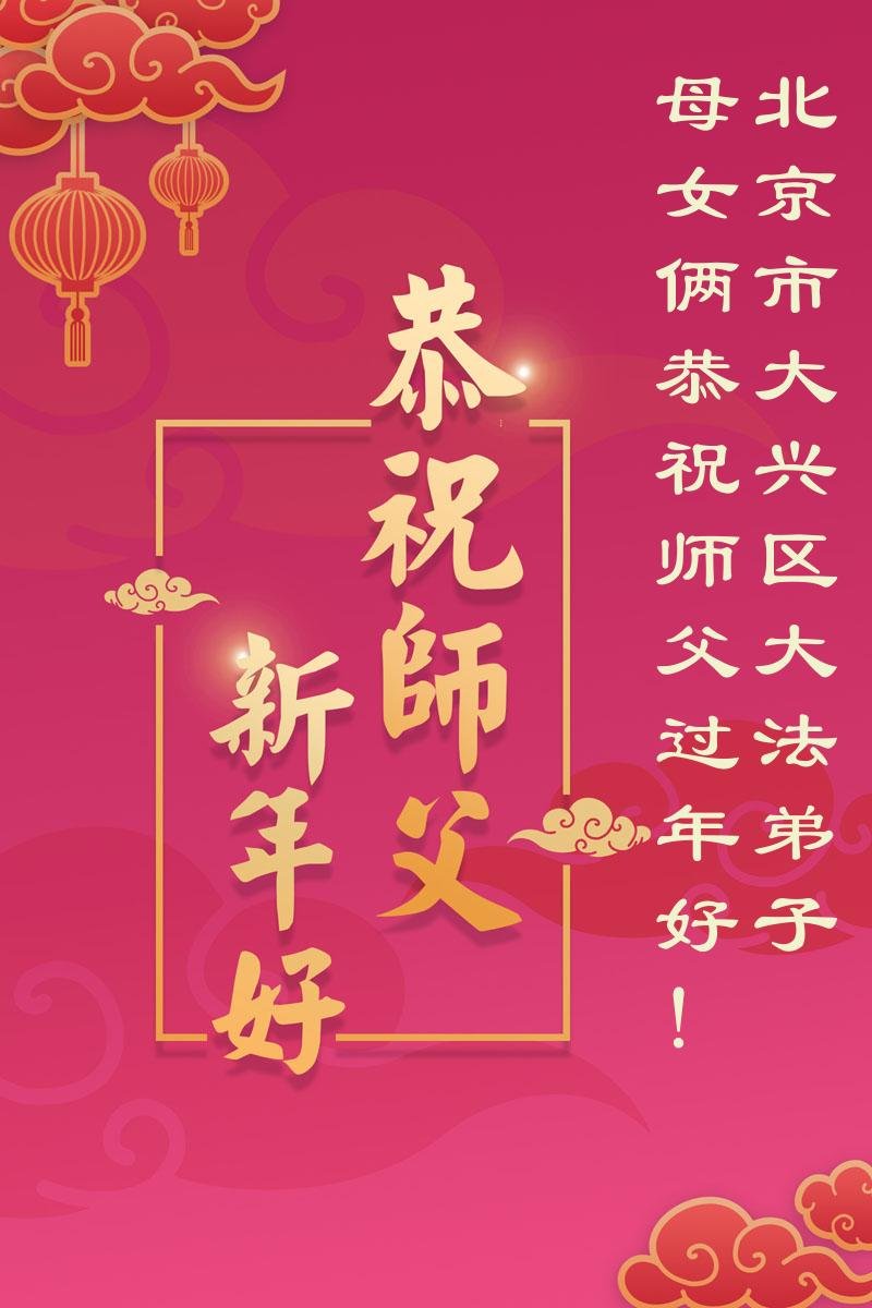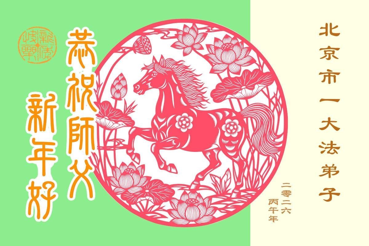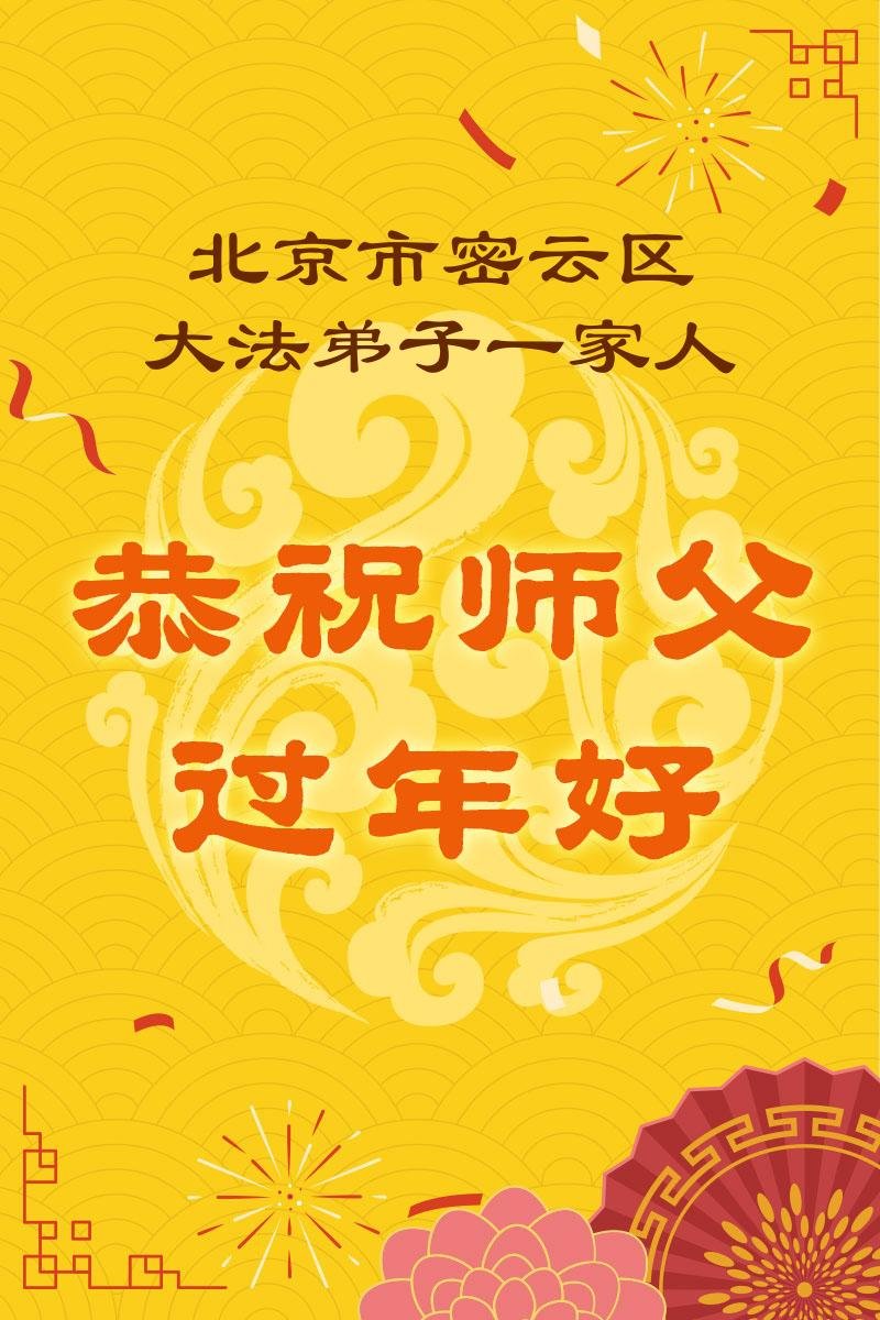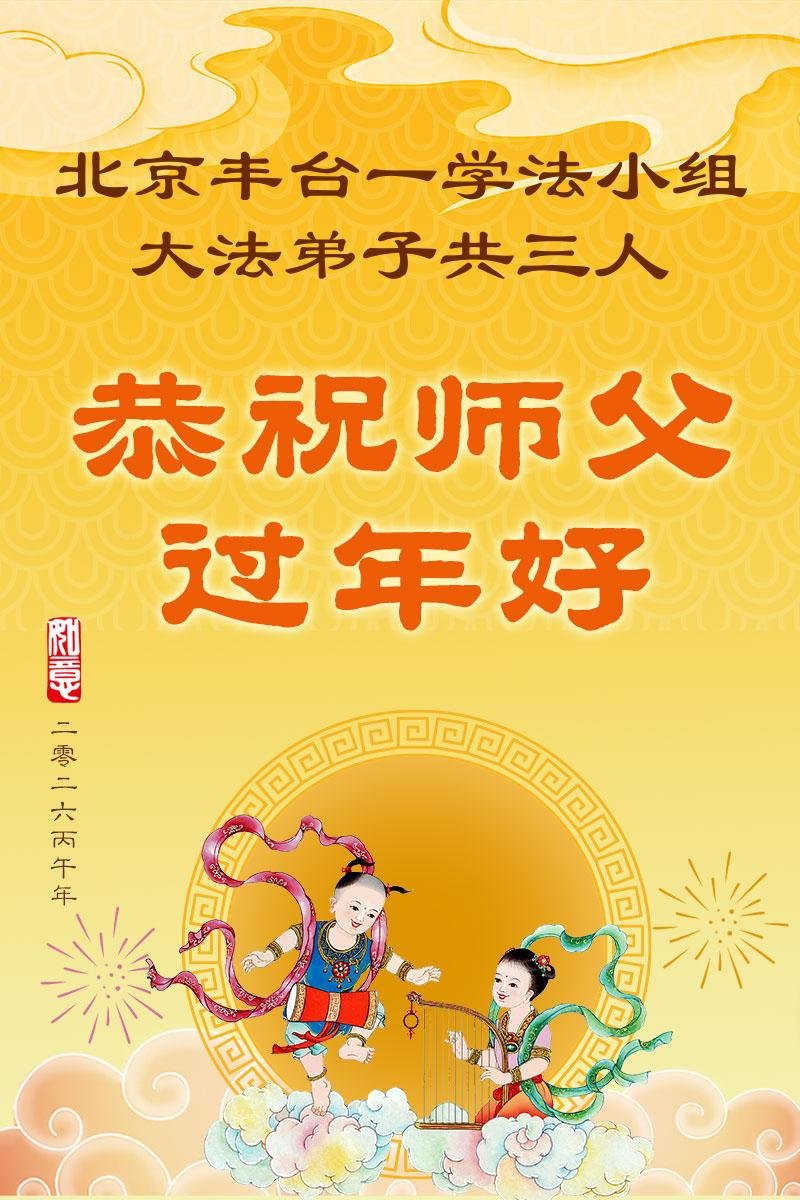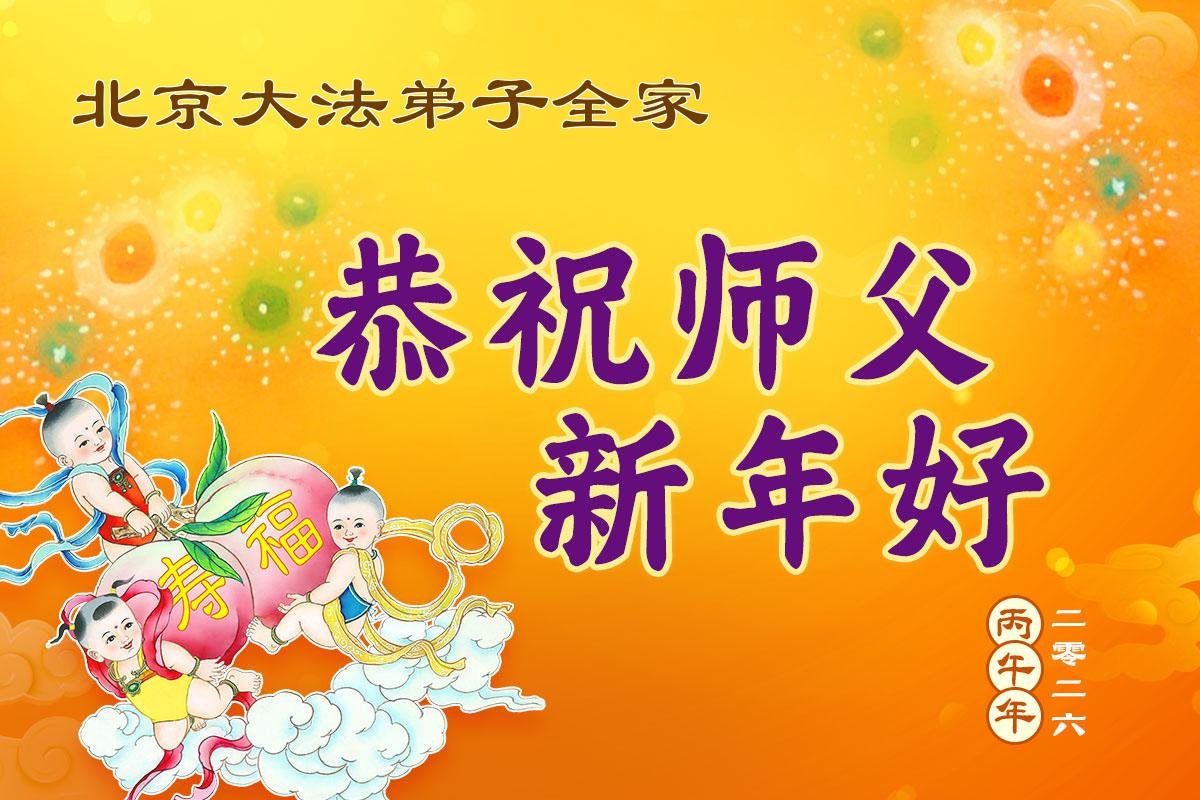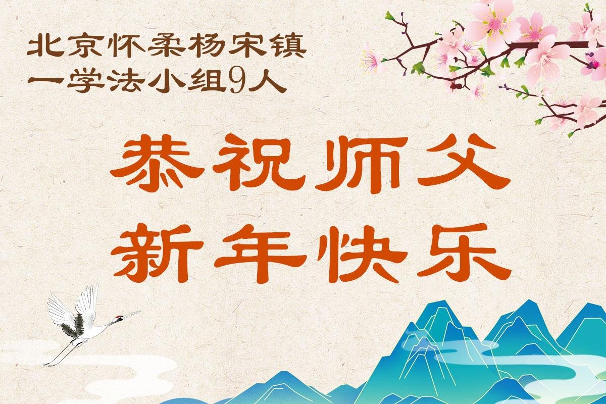 在新的一年到来之际,我们北京学法小组全体大法弟子向慈悲伟大的师尊拜年!师父您好!您辛苦了!我们有信心和决心在新的一年遵照师尊的谆谆教导,修去人心,做好三件事,学法修心向内找,讲真相,做个名副其实的大法弟子,跟师父回家。