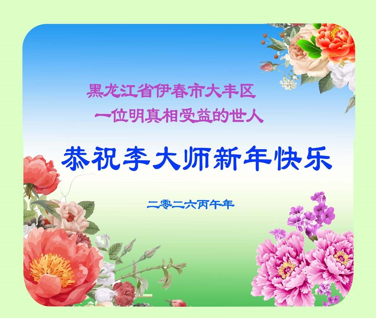 【明慧网二零二六年二月十九日】(明慧网通讯员综合报道)二零二六丙午年到来之际,中国大陆各省市明真相的民众纷纷表达对法轮大法的敬仰、对李洪志大师的感恩。