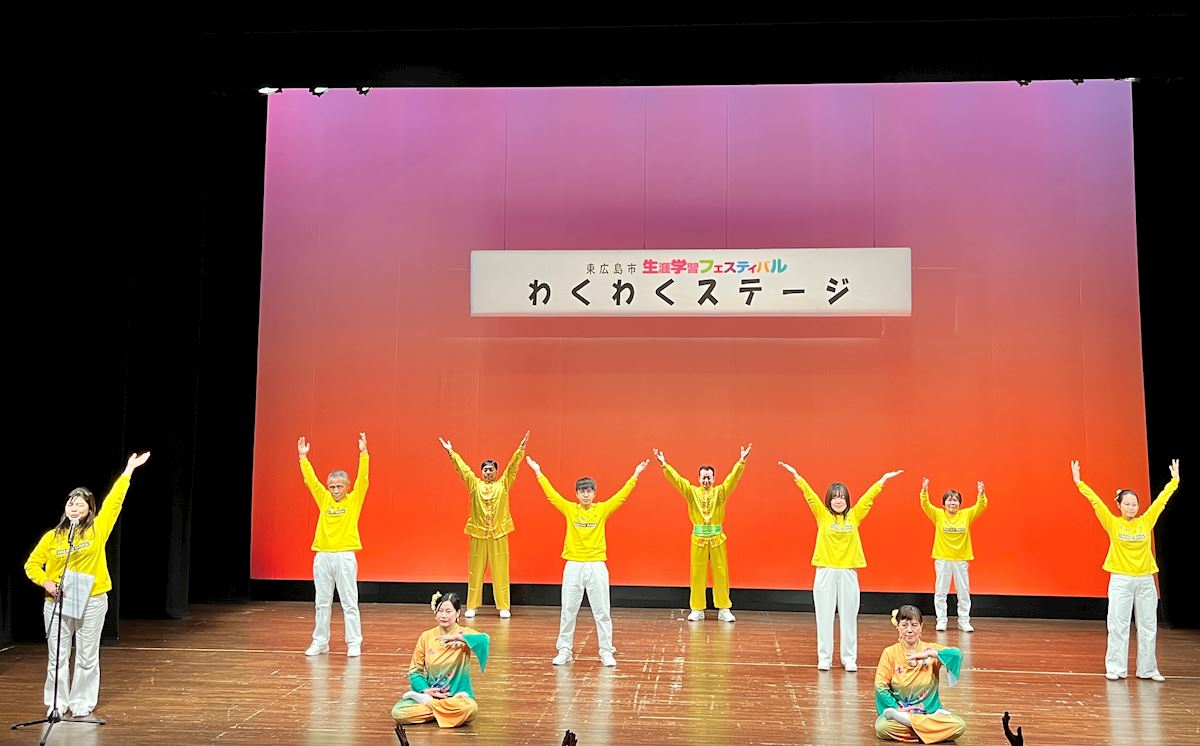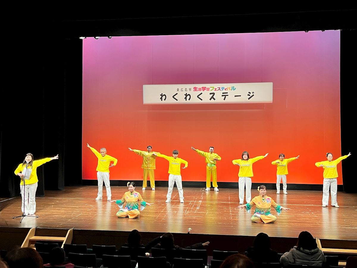【明慧网二零二六年二月九日】(明慧日本记者站报道)二零二六年二月八日,日本广岛法轮功学员参加了在东广岛艺术文化大厅举办的第三十五届“东广岛市生涯学习庆典”。法轮功学员在舞台表演腰鼓舞、介绍法轮功并演示法轮功的五套功法。不少观众表示学炼后身体非常舒服,也有的观众表示看法轮功学员的舞台表演很受感动。