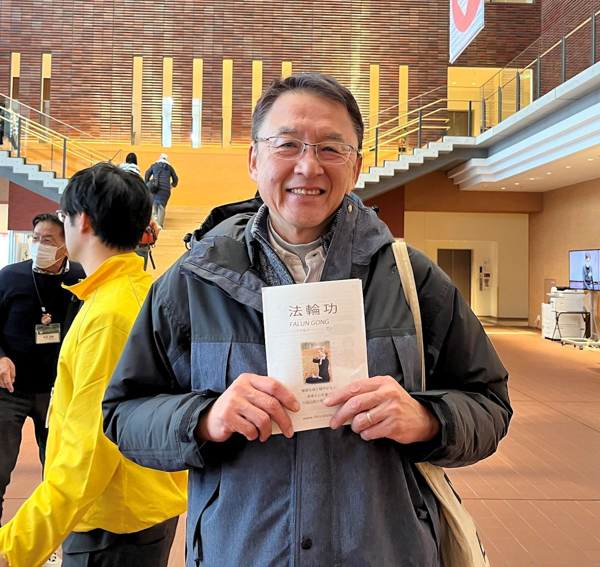 柴田先生说:“我虽然当时没跟大家一起学炼,觉得舞台表演时穿的黄色服装很靓丽,给人一种祥和的感觉,看到你们的表演心情特别宁静。腰鼓也很棒”。他们每个人都很高兴的接过资料表示会回家阅读。